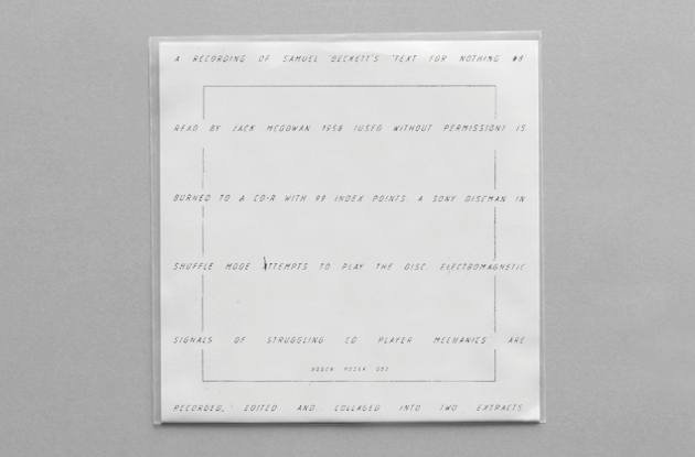 A recording of Samuel Beckett’s ‘Text for Nothing #8’ read by Jack McGowan 1958 (used without permission) is burned to a CD-R with 99 index points. A Sony Discman in shuffle mode attempts to play the disc. Electromagnetic signals of struggling CD player mechanics are recorded, edited and collaged into two extracts.